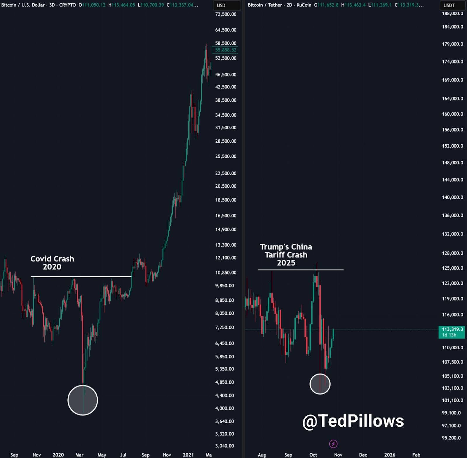 The recent 2025 structure looks much the same a sharp drop to around $100,000, then a quick rebound above $110,000.