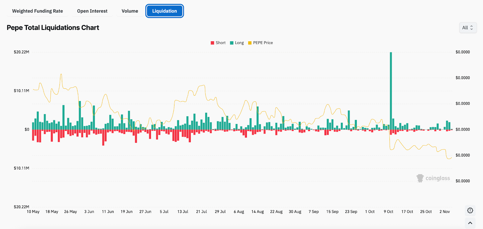 Pepe’s liquidation data shows a steady blend of long and short positions getting wiped out over the past six months, mostly during quick price swings.