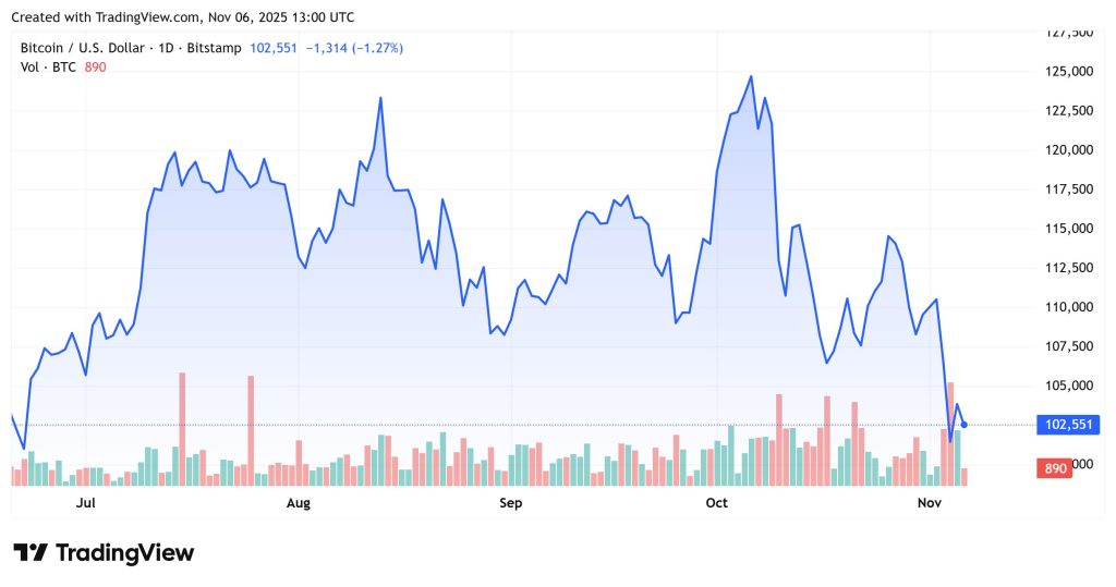 At the time of writing on Thursday, Bitcoin trades at $102,551, down 1.27% in the past 24 hours. The coin touched an intraday low near $101,500 and briefly rebounded toward $103,000 before consolidating.