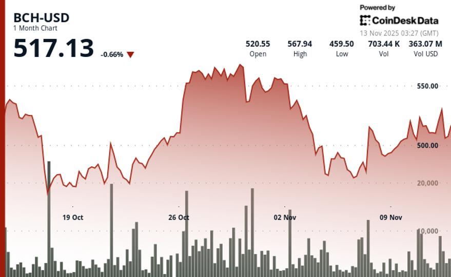 According to CoinDesk Research’s technical analysis data model, posted solid gains during Wednesday’s session, advancing 1.9% from $508.32 to $518.01 amid heightened volatility across crypto markets. The move established clear bullish momentum within a $32.78 trading range, representing 6.4% intraday volatility as BCH outperformed while most altcoins stumbled at key resistance zones.