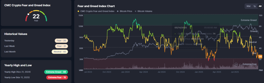 Crypto markets have responded swiftly to the deteriorating macro picture. The widely-tracked Fear & Greed Index slid to 22, its lowest reading since April, signaling growing anxiety across digital assets.