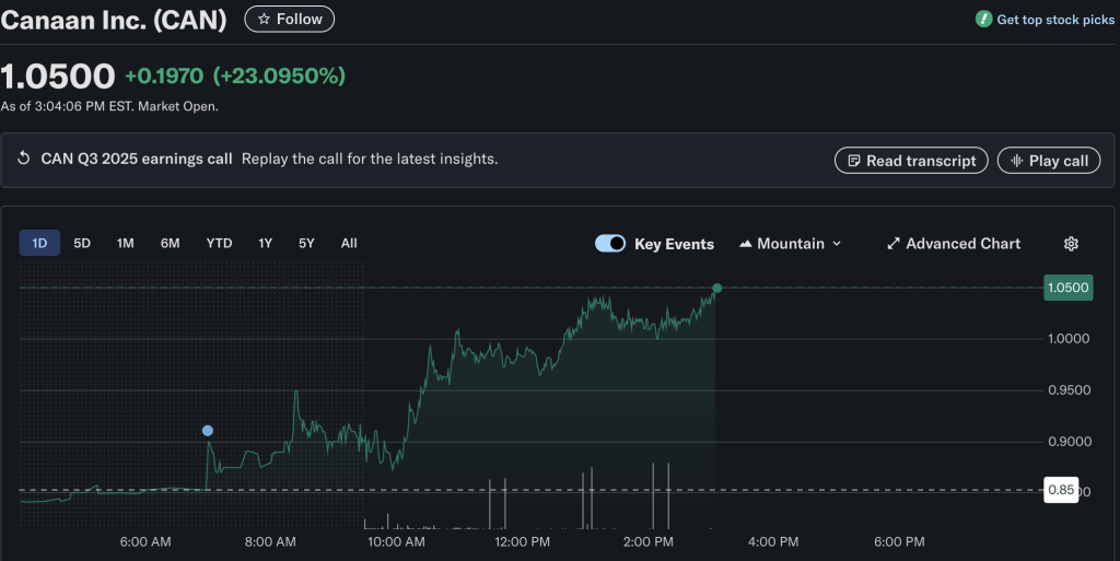 The rally sent shares of Canaan up roughly 16% by mid-morning, briefly approaching the $1 mark, according to Yahoo Finance.