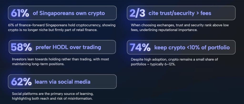 Surveying 3,513 retail investors and crypto-curious adults in Singapore, the study found that 61% of “finance-savvy” Singaporeans now hold crypto, marking one of the strongest adoption levels recorded in the country.