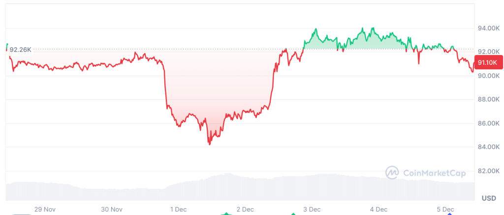 Bitcoin sits just above $91,000 after falling steadily from yesterday’s $92,000, marking a 2% decrease over 24 hours.