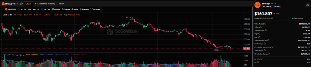 The move came as Strategy shares fell to $163.55 by 13:56 EST on December 15, down 7.29% on the day. Trading activity was heavy, with $2.32 billion in value changing hands across nearly 14 million shares.