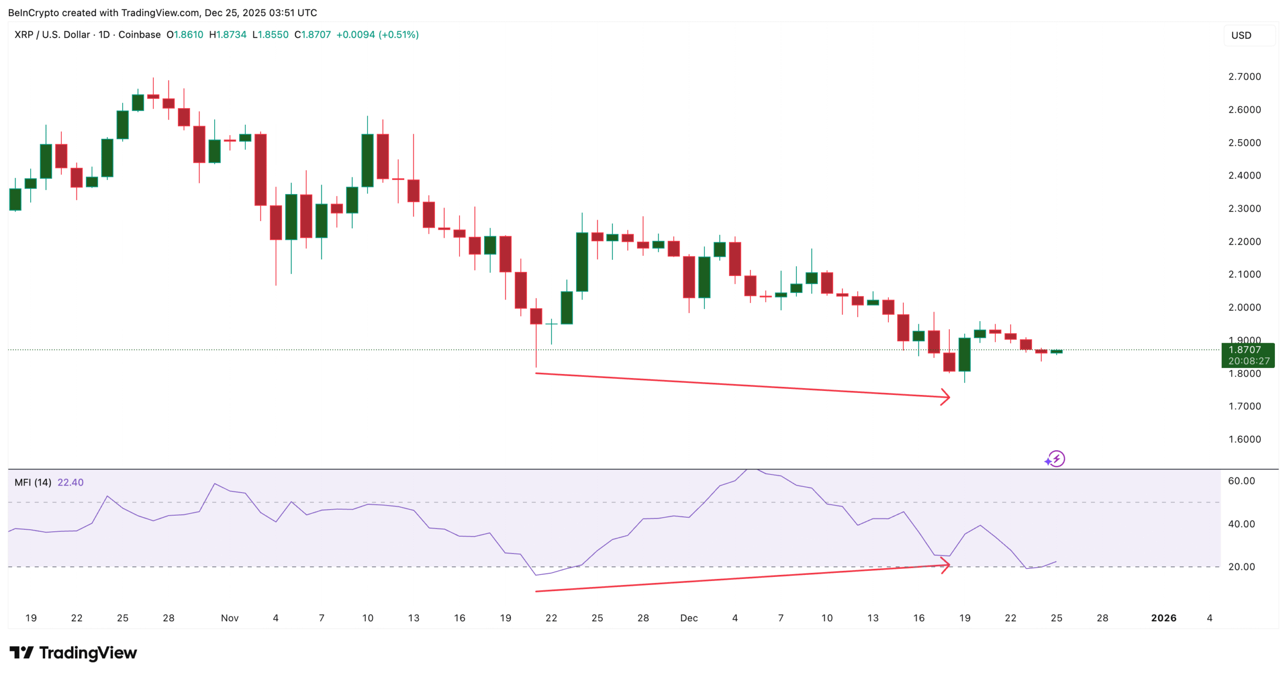 Between November 21 and December 18, the price trended lower, but the MFI trended higher. That hints at dip-buying pressure and money rotating back in even while the price hesitated. In response, the XRP price began to rebound after December 18.
