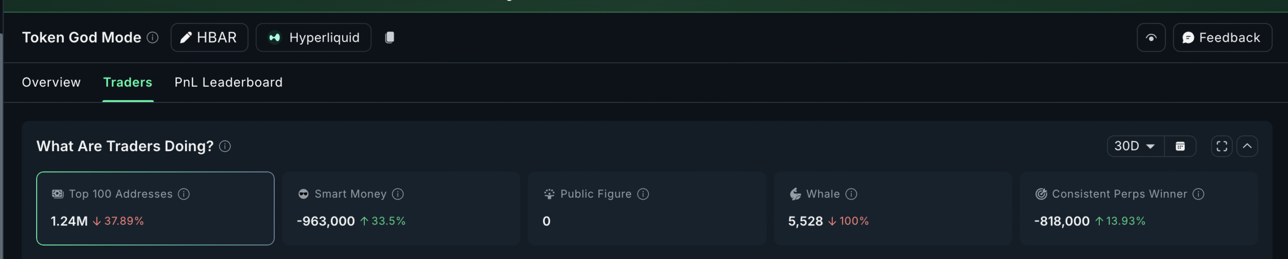 Smart money is still net short over the last 30 days, but the size of short exposure has begun to shrink. Consistent perp winners are also net short, but they are opening fresh longs, almost 14% over 30 days. These groups often rotate early before direction changes.