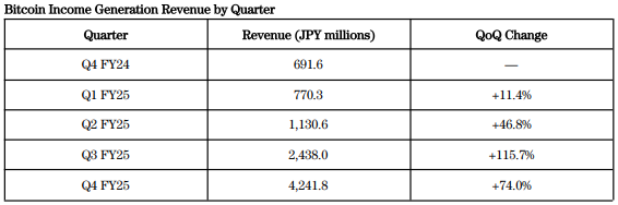 Also, revenue growth accelerated sharply through the year as its Bitcoin income generation revenue rose from ¥691.6 million in the fourth quarter of fiscal 2024 to ¥770.3 million in the first quarter of fiscal 2025.