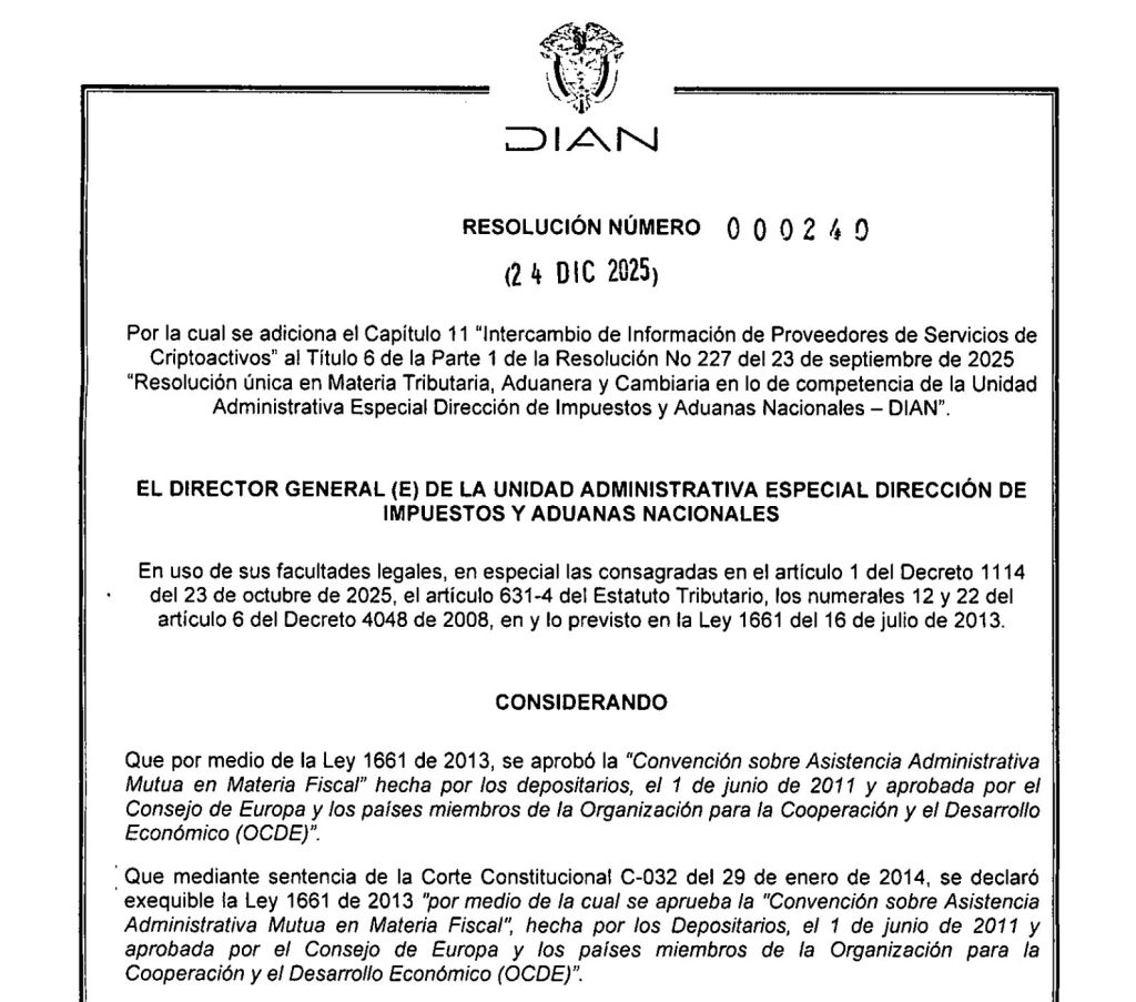Under Resolution 000240, issued by the Directorate of National Tax and Customs (DIAN) in late December 2025, Colombia has formally adopted the OECD’s Cryptoasset Reporting Framework.