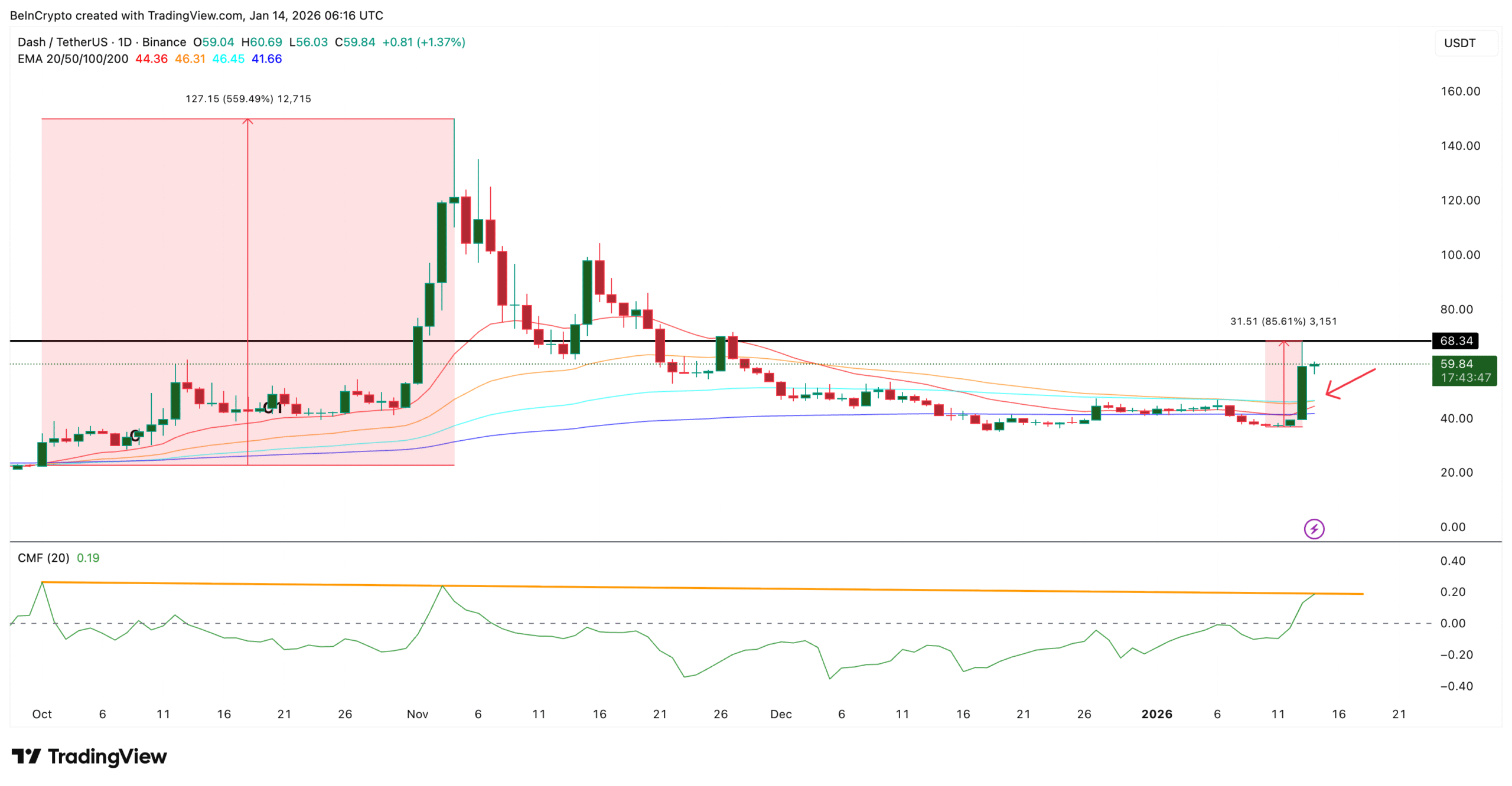 While OBV lagged, Dash’s trend structure tells a more constructive story. Over the same January rally, the DASH price reclaimed all major exponential moving averages (EMAs) on the daily timeframe. EMAs give more weight to recent prices and help identify trend shifts earlier than simple moving averages.
