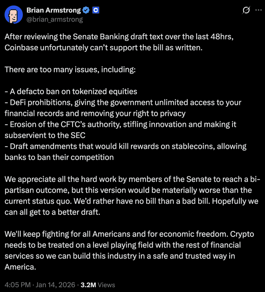 Coinbase’s CEO, Brian Armstrong, pulled his support on the eve of the Senate Banking Committee debate, warning that the latest draft could cripple core revenue lines, while state regulators and some Democrats argued the bill still weakens investor protections, forcing leadership to postpone rather than risk a failed vote that could push comprehensive U.S. crypto market‑structure reform off the 2026 agenda entirely.