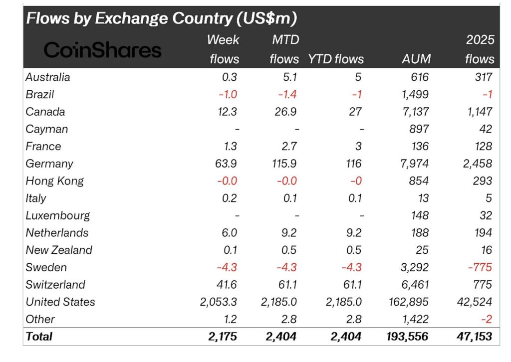 Regionally, flows were overwhelmingly positive. The US led with $2.05 billion in inflows, while Germany ($63.9M), Switzerland ($41.6M), Canada ($12.3M) and the Netherlands ($6.0M) also saw notable demand.