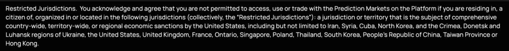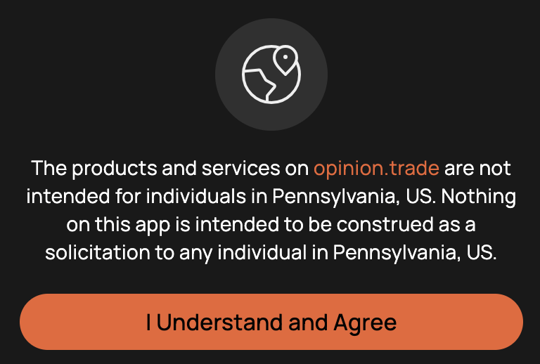 At Opinion, users connect a crypto wallet and trade permissionlessly. There are no segregated accounts, no federal oversight, and no registration with U.S. regulators. It geoblocks U.S. IP addresses, but enforcement is limited to the honor system and VPN detection. More than a dozen additional countries and territories are listed on Opinion’s restricted jurisdictions list, including China and the United Kingdom. Interestingly, the site also has a special pop-up notice against using its platform in Pennsylvania.