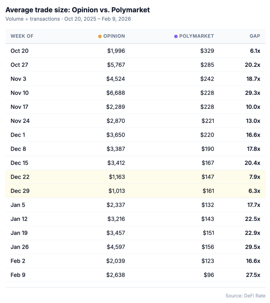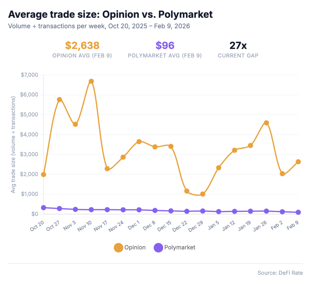 This has been the platform’s structural signature since launch. As we reported in our post-Super Bowl volume report: “Opinion’s 608,906 transactions against $1.24 billion in volume continues to underscore its unusually large average trade size of roughly $2,038 per transaction, compared to $157 at Kalshi and $123 at Polymarket.”