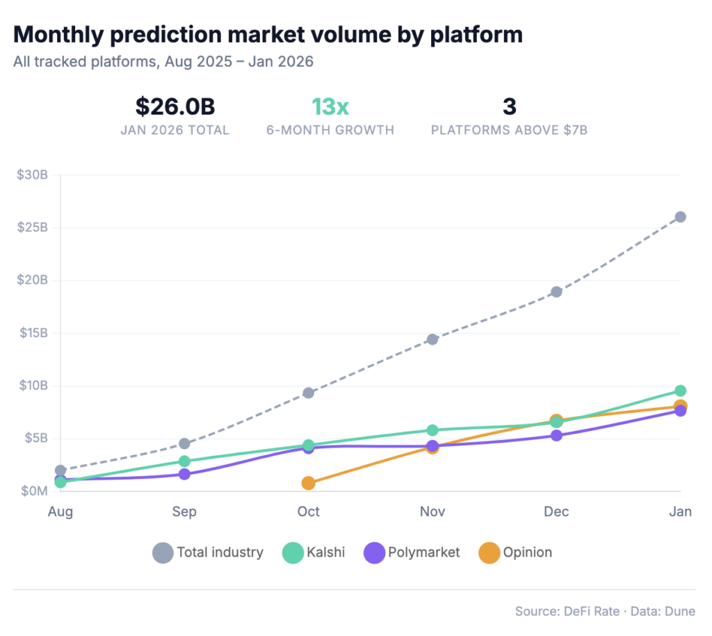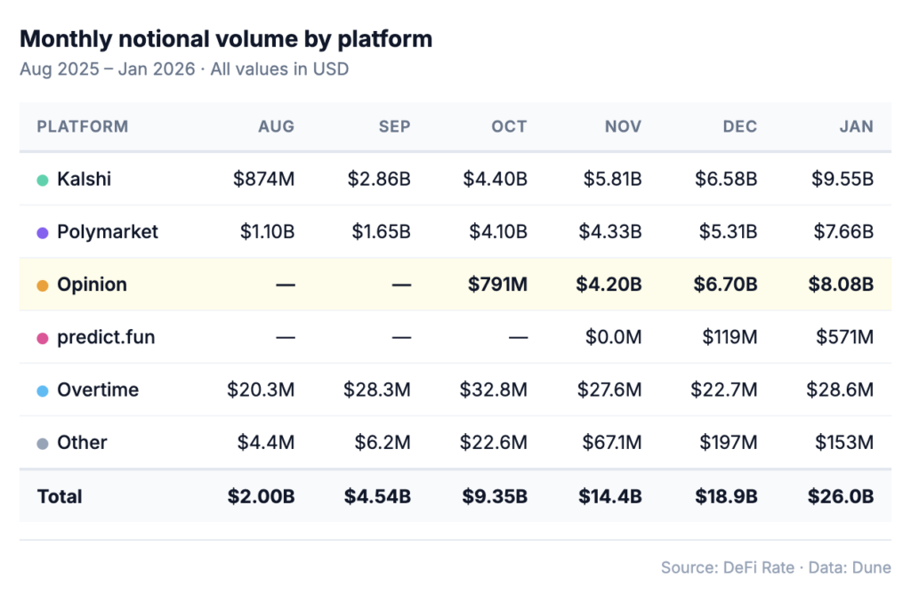 The industry-level growth is staggering and real. As we reported in a recent volume report, the prediction market industry grew roughly 13x in six months, from $2 billion in total monthly volume in August 2025 to $26 billion in January 2026. That growth was not evenly distributed, and Opinion’s arrival was a major part of the story.