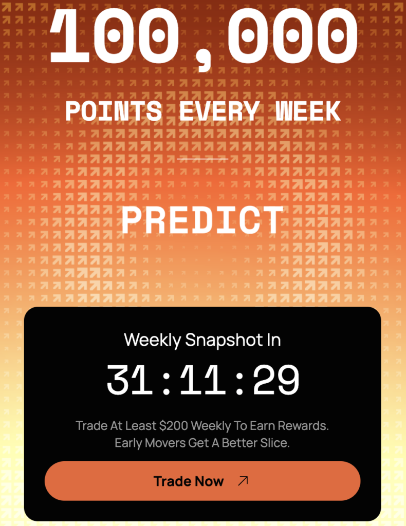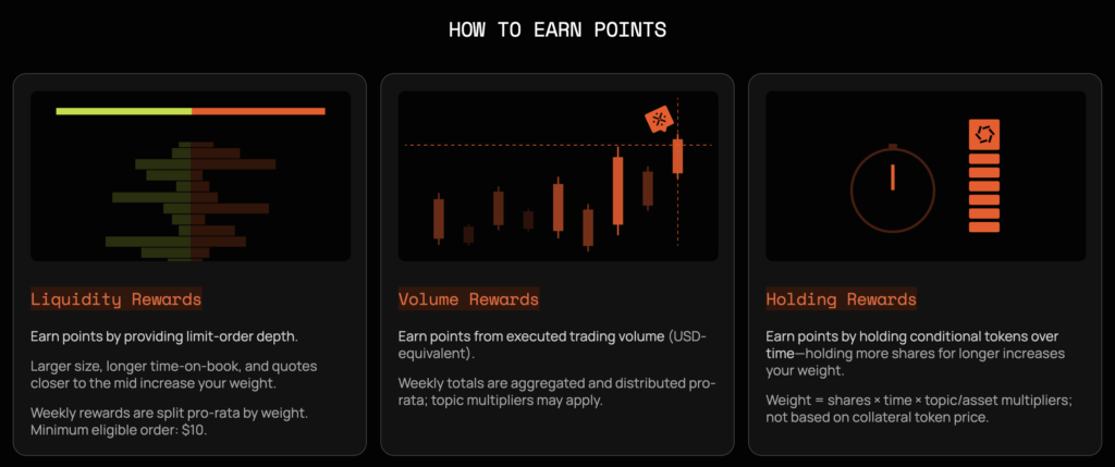 Opinion runs the OPINION Point System (PTS), its primary mechanism for rewarding participation ahead of an expected token launch ($OPN). Per the platform’s official documentation, a fixed pool of 100,000 points is distributed weekly to users who meet a $200 minimum volume threshold. Points are scored across three dimensions: limit order placement (rewarding liquidity provision near the market mid-price), trade size (explicitly “designed to reward conviction and information contribution”), and position holding duration.