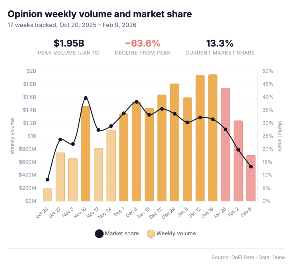 Those early flags didn’t slow Opinion’s growth. Its volume kept climbing into the new year, peaking at $1.95 billion the week of Jan. 19. Then its recent decline began. And the data the early observers flagged has only intensified.
