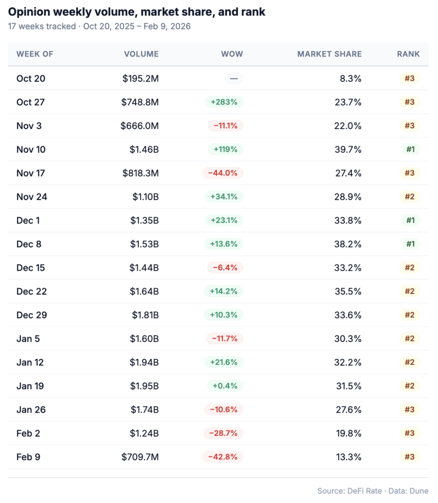 Then it fell. Four consecutive down weeks: $1.95B → $1.74B → $1.24B → $709.7M. That’s a 63.6% decline, by far the steepest pullback of any major platform during that stretch. As we noted in our Feb. 9 volume report, “Opinion’s 28.7% WoW drop to $1.24 billion is its lowest weekly volume since early January and pushes it firmly into third, well behind the Kalshi-Polymarket pair.” The following week it dropped another 42.8%.