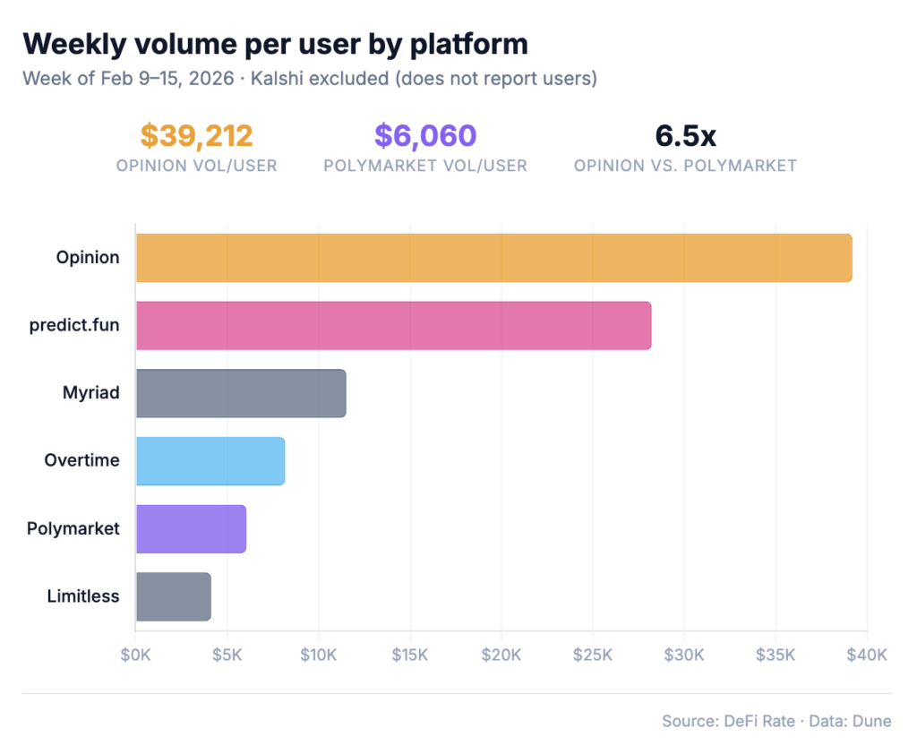 The per-user figures amplify everything. For the most recent tracked week (Feb. 9), Opinion had 18,098 weekly active users generating $709.7 million, roughly $39,200 per user. Polymarket’s 309,991 users generated $1.88 billion, about $6,060 per user. The gap is 6.5x.