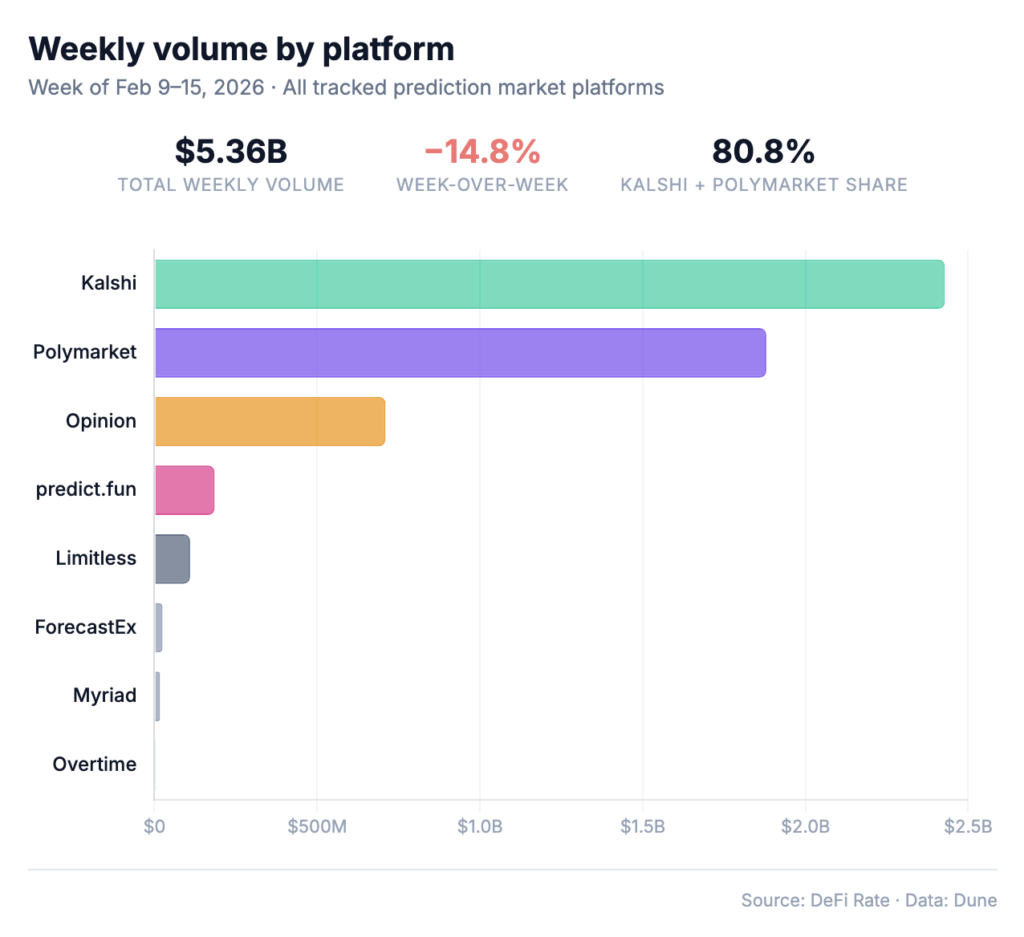 Volume, transaction, and user data sourced from Dune Analytics prediction market dashboards. Kalshi and Polymarket real-time data from DeFi Rate’s prediction market tracker. Historical volume data compiled from DeFi Rate’s weekly volume report series.