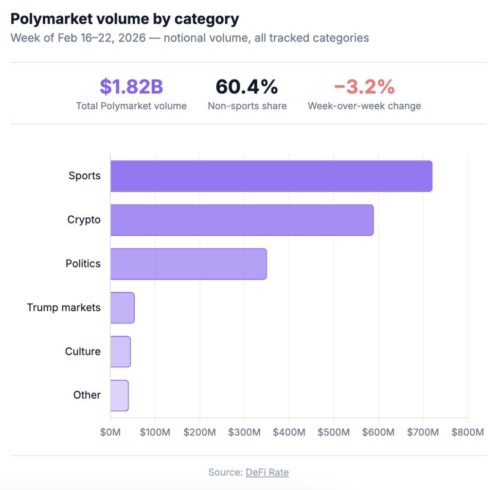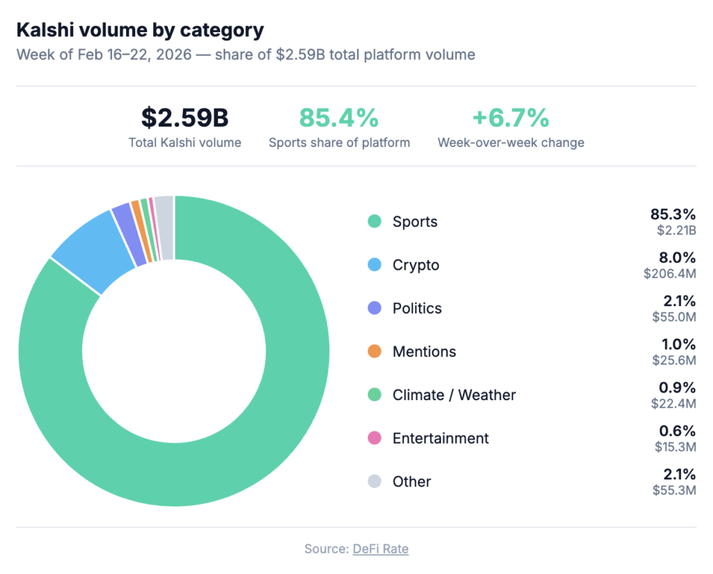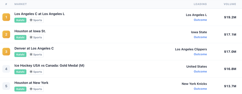 The category breakdown explains what’s filling the post-NFL gap. Sports volume came in at $2.21 billion, up from $1.996 billion the prior week: a 10.9% increase without any football on the schedule. The main drivers include NBA, NCAAB and some Olympic events, notably the USA-Canada hockey final. The NBA regular season resumed Thursday after the All-Star break, with conference standings tightening as the playoff picture comes into focus, and college basketball markets deepening as Selection Sunday (March 15) moves into view.