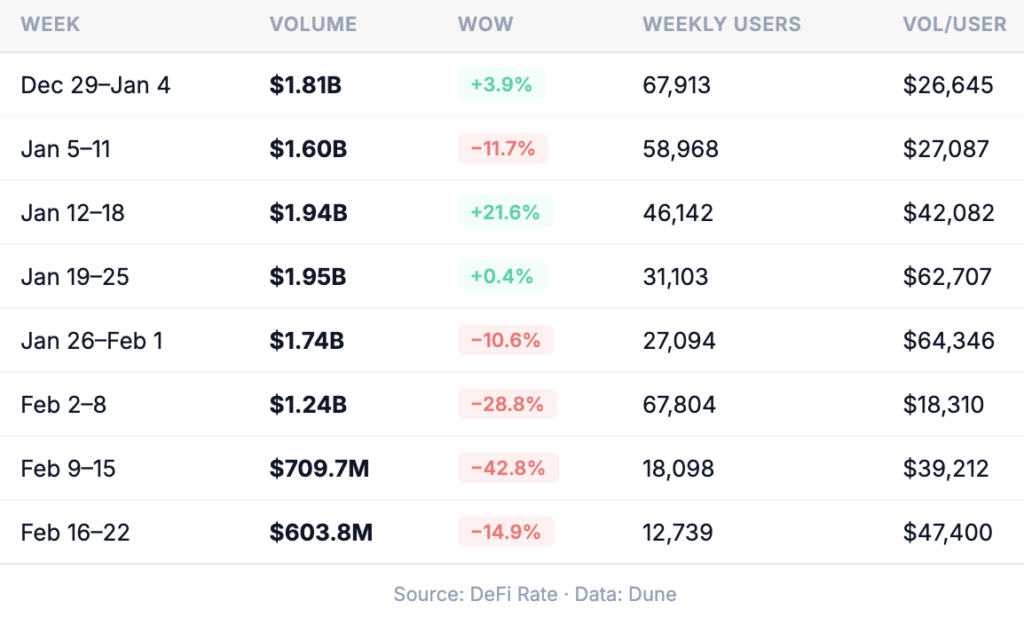 That’s a significant user pullback on a smaller volume dip. The data raises some questions: Polymarket processed 22.7 million transactions last week with 17.8% fewer users, meaning the remaining base traded more frequently and likely in larger average trade sizes. Whether that’s healthy consolidation around engaged power users or early-stage retail churn remains to be seen in the coming weeks.