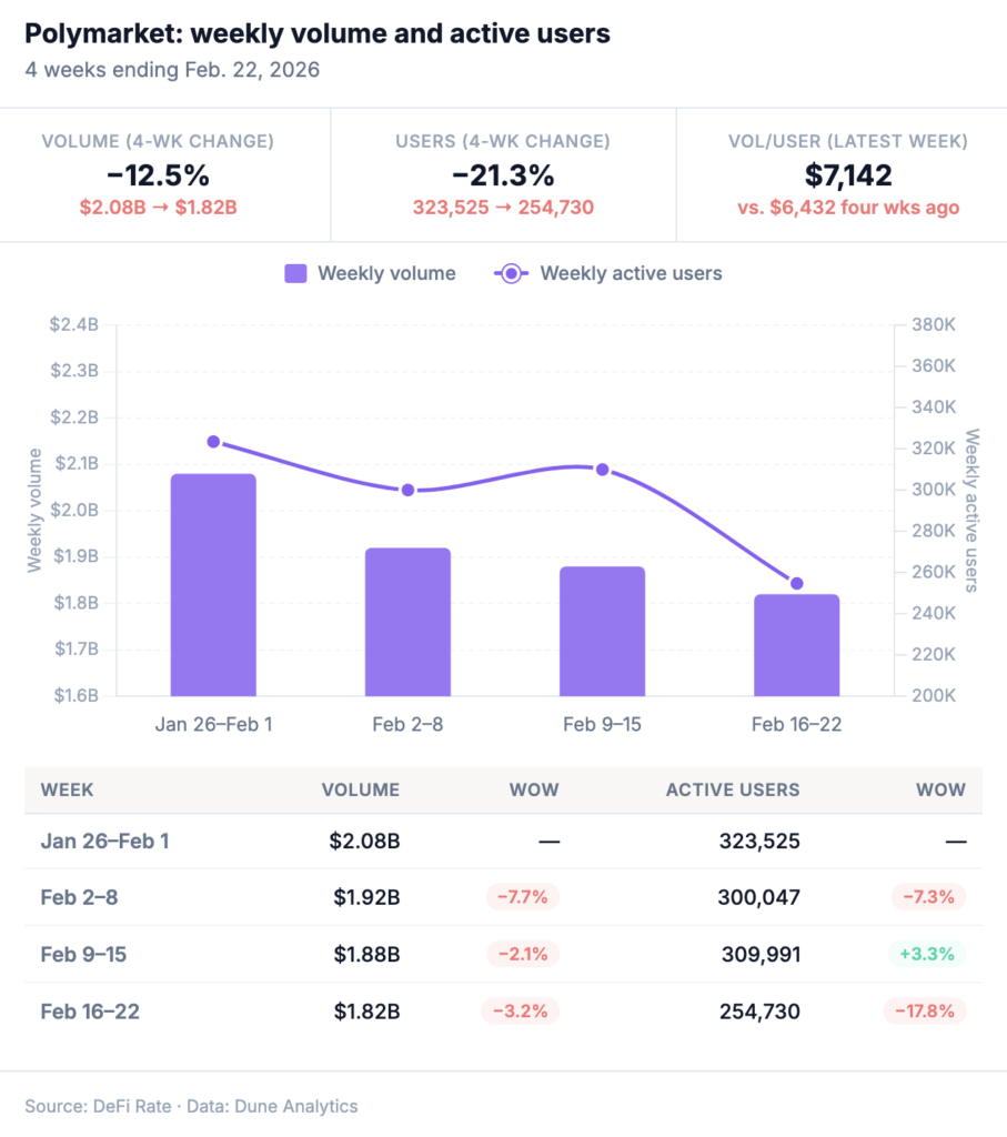 Polymarket held up reasonably well this week on volume — down 3.2% to $1.82 billion — but the user number that came back from Dune is hard to ignore. Polymarket’s 254,730 weekly active users was down from 309,991 the prior week, representing a drop of nearly 18% in one week.
