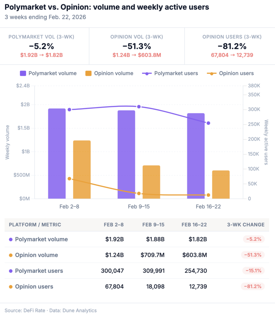 Opinion logged a third straight week of meaningful volume decline coming in at $603.8M, down 14.9% from $709.7M. The platform has now shed 63.6% of its volume since its Jan. 19 peak of $1.95 billion across four consecutive down weeks.