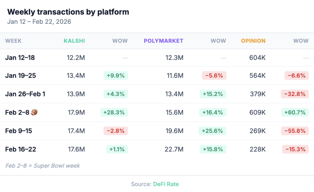Kalshi’s 17.6 million transactions were nearly neck and neck with Polymarket’s, reflecting the platform’s high-frequency sports trading infrastructure. Together, Kalshi and Polymarket accounted for 98.2% of all tracked transactions this week.