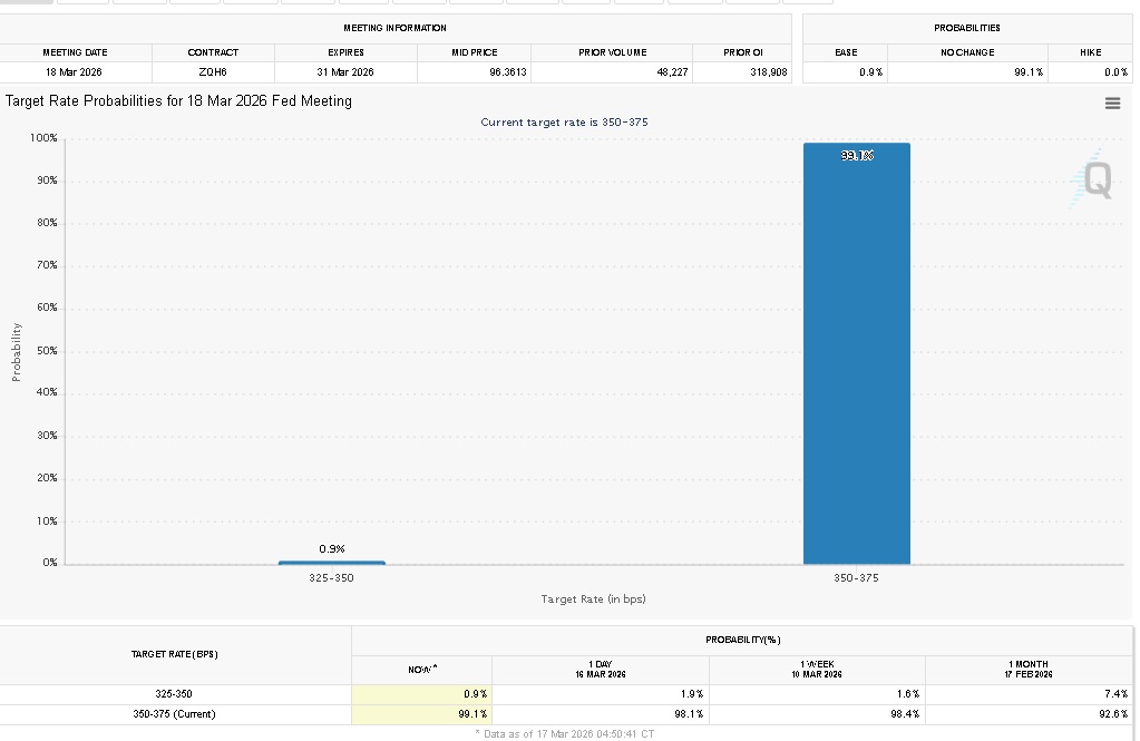 Despite the rhetoric, the data do not support an emergency cut. CME futures markets indicate a 99% probability that rates will remain unchanged this week.