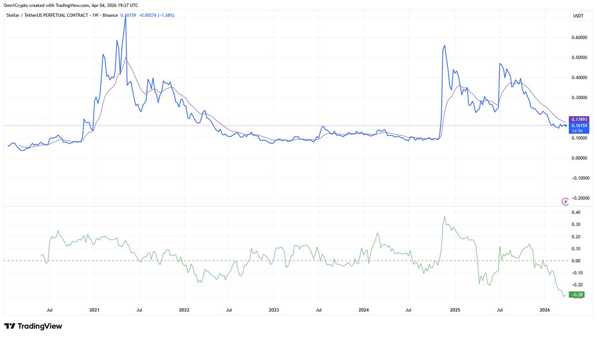 This mirrors the mid-tier Bollinger Band (BOLL), painted in blue color in the weekly XLM price chart below. It’s safe to say that the current $0.161 support zone could take XLM back to the $0.178 price level, aligning with the Smoothed Moving Average (SMA), depicted in purple color.